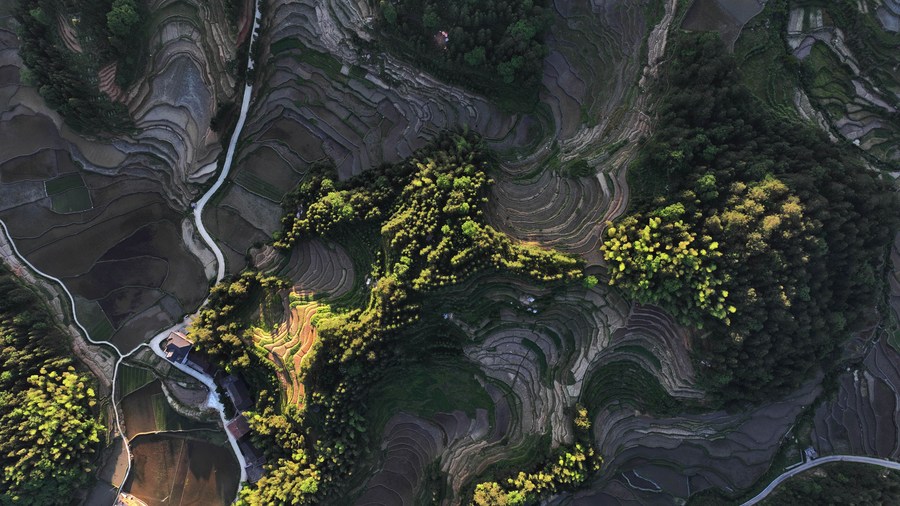 圖為5月17日拍攝的夕陽映照下的紫鵲界梯田(無人機照片)。新華社記者 趙眾志 攝