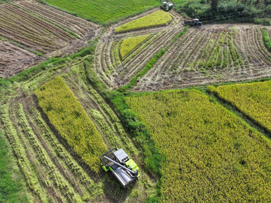 圖為湖南省瀏陽市沿溪鎮建設村水稻收割畫面(無人機照片)。 新華社記者陳澤國 攝