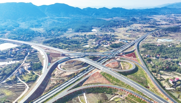 11月28日,俯瞰衡永高速與二廣高速互通樞紐,縱橫交錯的高速路網與生態鄉村構成美麗的景觀。目前,衡永高速公路主體工程基本完成,已全面進入掃尾階段,預計明年5月建成通車。雷中祥 蔣凌志 攝影報道