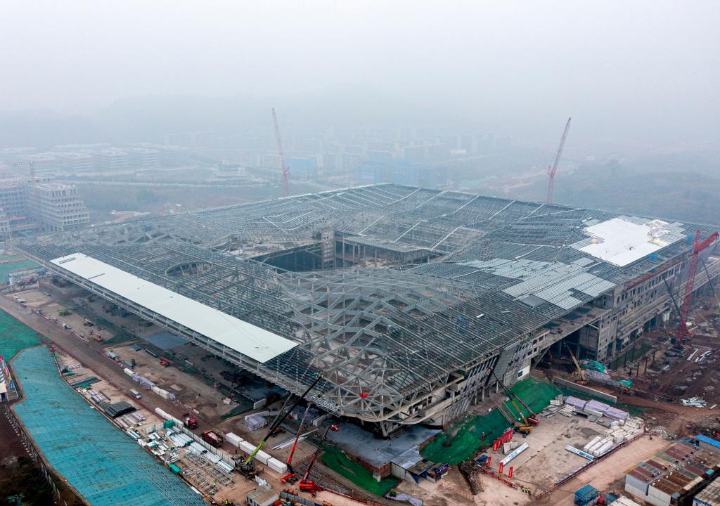 1月10日拍攝的西部(重慶)科學城科學會堂項目施工現場(無人機照片)。新華社記者 劉潺 攝