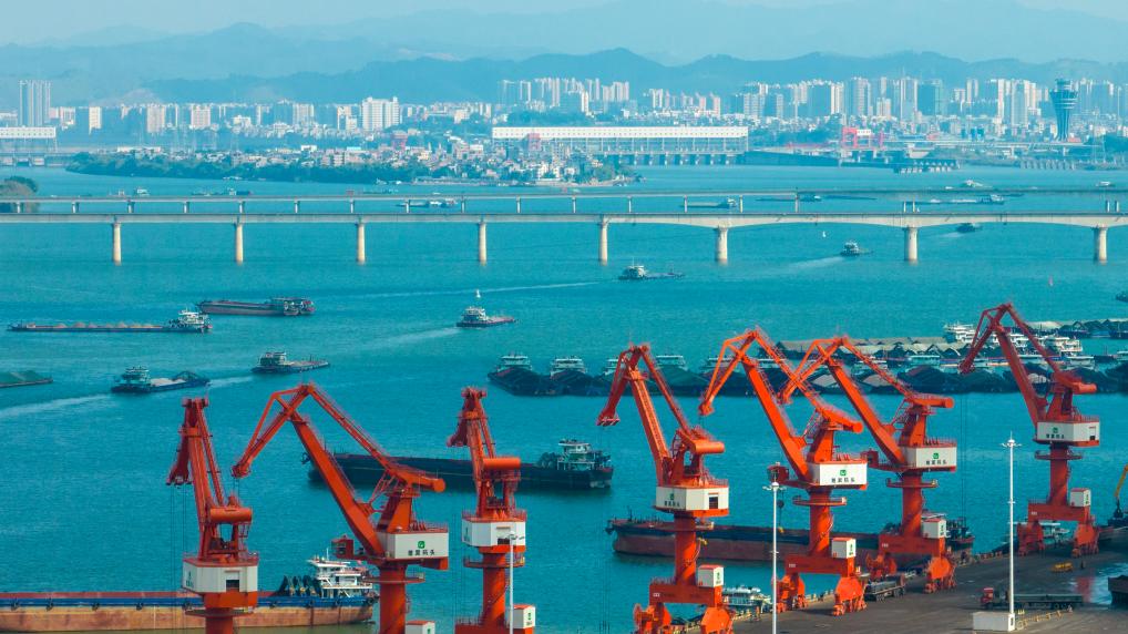 1月3日,在廣西梧州臨港經濟區赤水港碼頭,工人操作設備在碼頭上進行裝卸作業(無人機照片)。新華社發(何華文攝)
