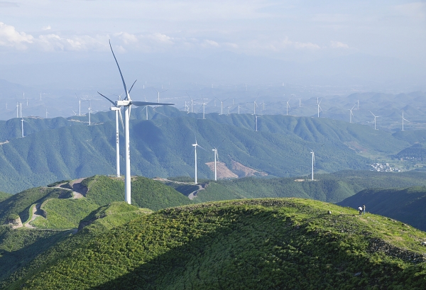 江華瑤族自治縣西邊大嶺風力發電場,風機與秀美青山、藍天白云相映襯,景美如畫。蔣克青 楊丁香 攝影報道(湖南圖片庫)