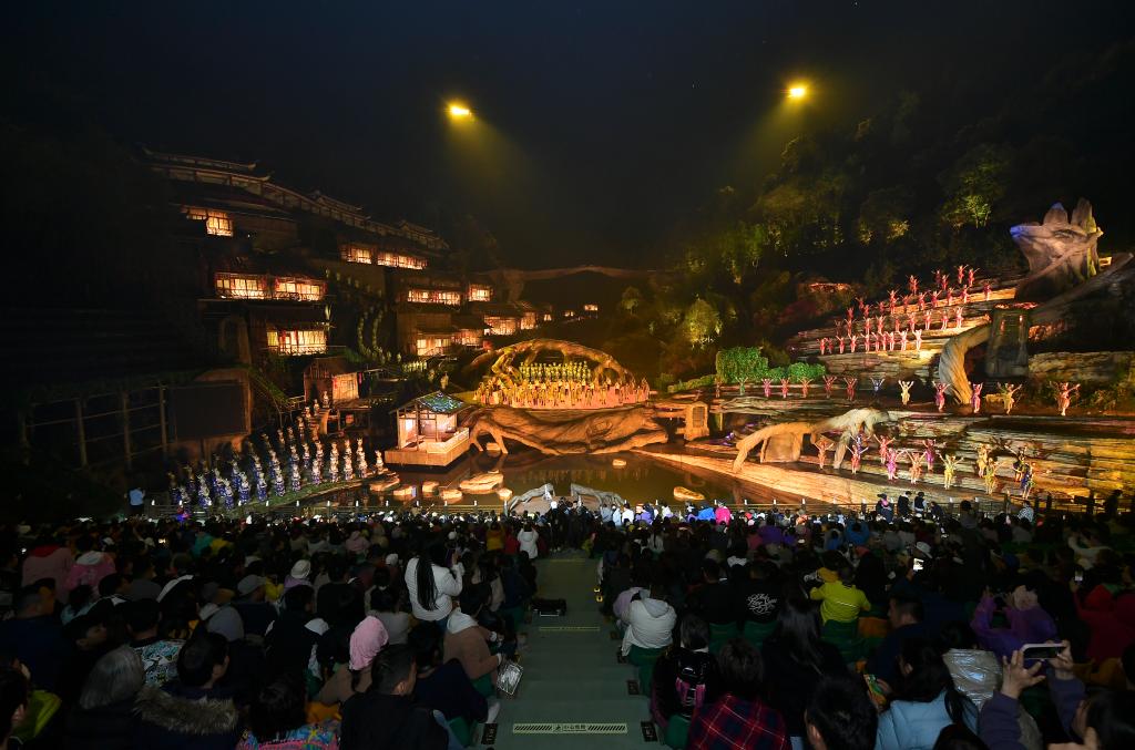 夜幕降臨,嘹亮的歌聲在張家界天門山下的峽谷間回蕩,全新升級的實景音樂劇《天門狐仙》在此上演。演出以張家界的絕美山水為背景,通過聲、光、電、AI和裸眼3D技術,將一段愛情故事娓娓道來。