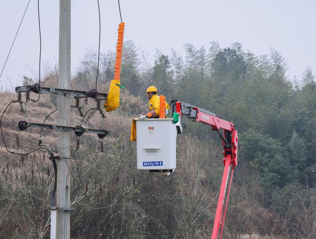 國網長沙供電公司帶電作業分公司配網不停電作業六班班長喻暉正在開展帶電檢修作業。(石磊 攝)