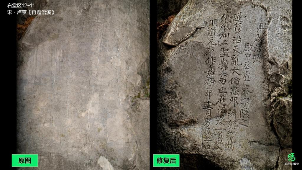浯溪摩崖石刻修復前(左)與修復后(右)。(馬欄山文化數字化創新中心供圖)