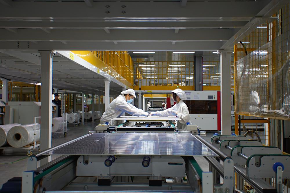 在安徽省滁州市鳳陽縣一家光伏企業內,工人在生產線上忙碌(2023年6月14日攝)。新華社發