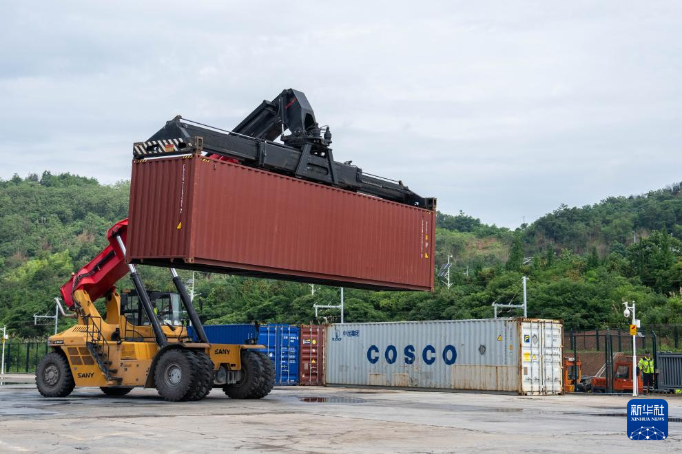 6月20日,在株洲中車物流園,工作人員在進行集裝箱裝車作業。新華社記者陳思汗攝