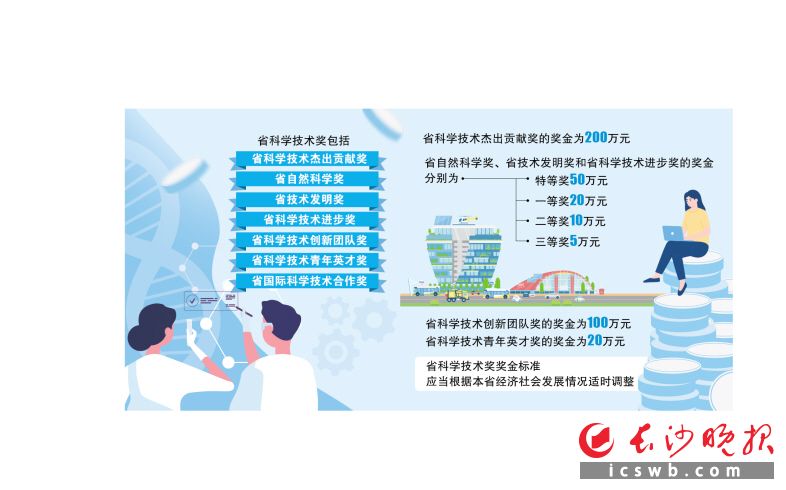 省人民政府設立湖南省科學技術獎(以下稱“省科學技術獎”),獎勵在科學技術進步活動中做出突出貢獻的組織和個人。省科學技術獎包括省科學技術杰出貢獻獎、省自然科學獎、省技術發明獎、省科學技術進步獎、省科學技術創新團隊獎、省科學技術青年英才獎、省國際科學技術合作獎等七大類別?!掇k法》著眼于我省科技人才隊伍培育,增設“省科學技術青年英才獎”,為青年人才成長增勢賦能。